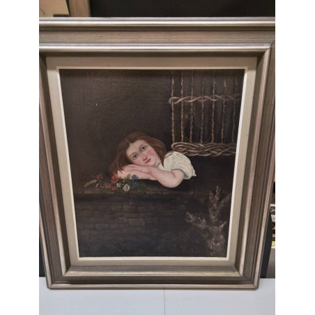 HUILE SUR PANNEAU ANCIENNE JEUNE FILLE ET L’OISEAU